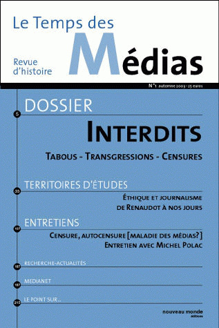 « Tabous et interdits » constituent le corps principal de cet opus. Ce faisant, Le Temps des médias s’engage sur les traces d’une des polémiques les plus vives concernant la presse sous toutes ses formes. Qu’en est-il de la censure aujourd’hui, dans une société qui se revendique comme ouverte et émancipée ? Les médias constituent en effet un moyen d’expression mais aussi un intermédiaire de l’information : ils sont donc leurs propres censeurs. Ou peut-on placer alors la notion d’objectivité si ces mêmes moyens de communication constituent un écran entre l’émetteur de l’information et son récepteur ?