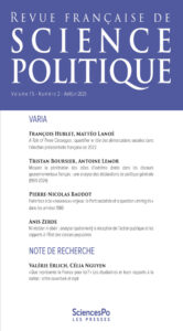 Created in 1951, the Revue française de science politique (French Review of Political Science) is published bimonthly by the French Political Science Association and Sciences Po, in collaboration with the French National Centre for Scientific Research. A leading scientific and academic journal both in France and abroad, the Revue française de science politique publishes peer-reviewed articles in every field of political science that make a significant contribution to the discipline, with abstracts in French and English, as well as reviews of current books and major international journals. We also regularly put out special issues on current research in a featured field of inquiry. Our target readership includes scholars and students of political and social sciences as well as policymakers and anyone interested in rigorous analyses of political phenomena.