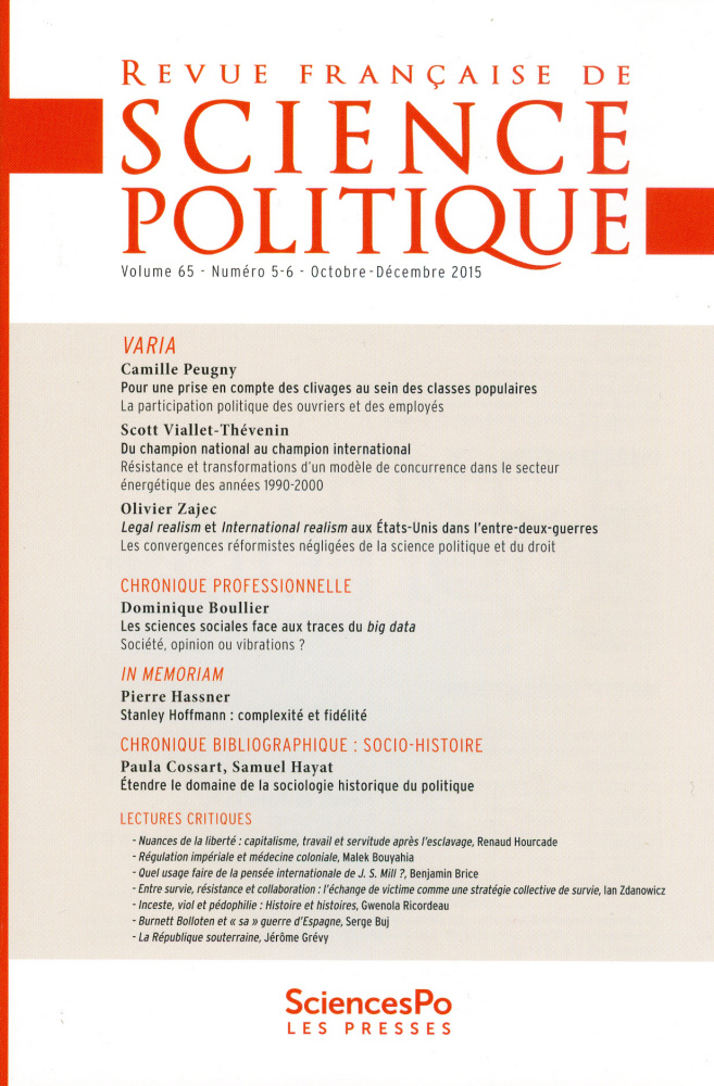 Revue francaise de Science Politique 2015 Publié le 12 janvier 2016 Partager cet article Facebook Twitter Google+ Retour à : Warning: Undefined variable $posttypehum in /home/entrevb/www/wp-content/themes/entrevues-new/single.php on line 147