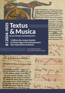 La revue Textus & Musica propose de stimuler, d’accueillir et de promouvoir le dialogue entre les disciplines philologique et musicologique qui, même lorsqu’elles se sont intéressées au même objet d’étude, se sont le plus souvent ignorées. Prenant naissance de l’expérience du groupe de recherche franco-italien « Philologie et Musicologie », actif depuis 2012 par notre commune initiative, Textus & Musica souhaite en prolonger la réflexion interdisciplinaire sur les compositions poético-musicales du Moyen Âge et de la Renaissance, en valorisant les études sur les corpus chantés, de toutes formes et de toutes traditions, provenant de toute aire culturelle de l’Europe jusqu’en 1600.